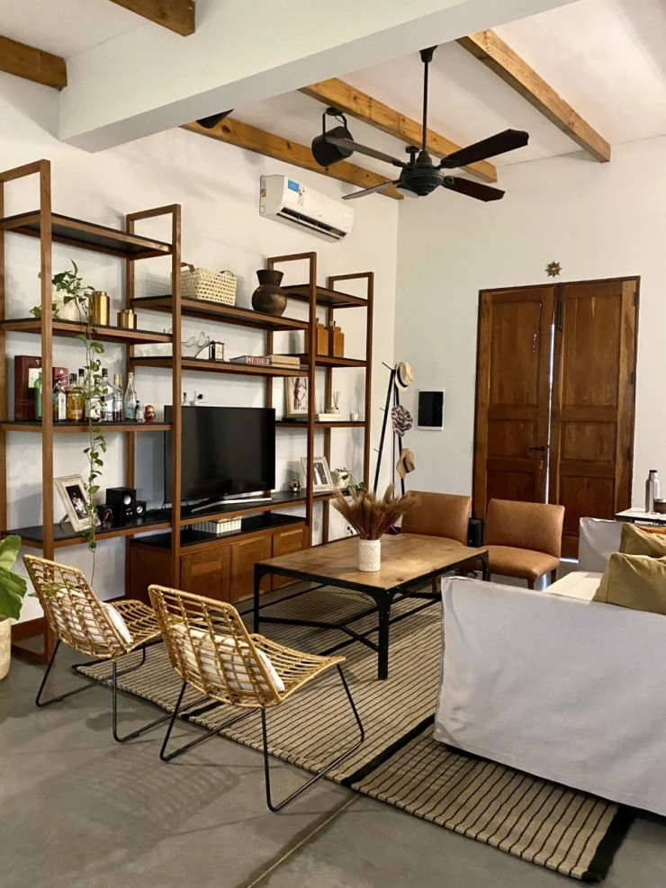 En el sector living se utilizó una alfombra muy canchera para sectorizar y se eligieron muebles de madera, fibras naturales y detalles en hierro negro. El gran ventanal de hierro con vidrios en color caramelo se convierte en un detalle que no pasa desapercibido.