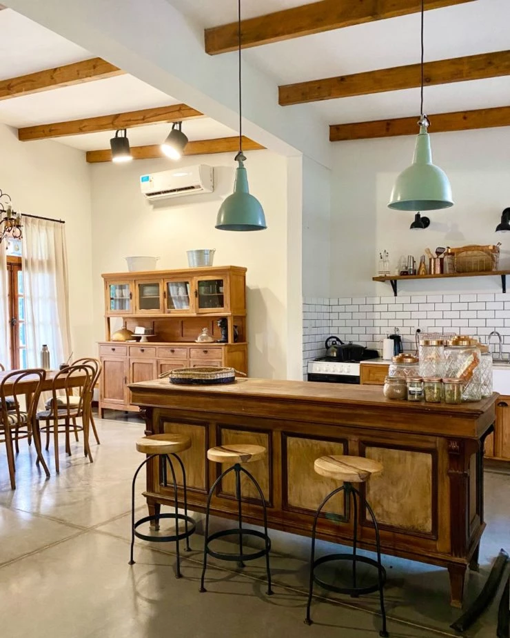 En el medio, un mostrador antiguo restaurado que oficia como isla y barra para comidas informales y sobre él, unas lámparas cancherísimas tipo galponeras en color verde agua.