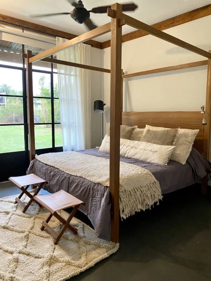 Los dormitorios son amplios como las típicas casas de campo. El principal cuenta con baldaquino de madera y con una amplia puerta de hierro y vidrio repartido que conecta directamente con el exterior.