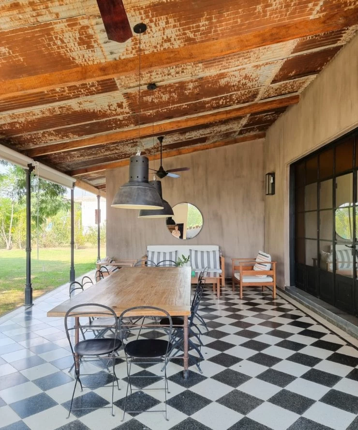 El piso damero blanco y negro le otorga una sensación de frescura y de casa detenida en el tiempo. Las chapas oxidadas de demolición presentes en el techo, las sillas de hierro negro y las lámparas colgantes tipo galponeras, aportan aires industriales muy marcados.