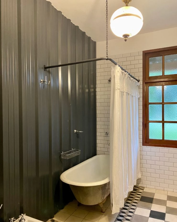 Todos los baños de la casa son amplios y con pisos calcáreos. El principal cuenta con detalles vintage como una bañera exenta antigua, cortina de algodón y puntilla, un toilette heredado de la abuela de la dueña de casa, y el detalle de una de las paredes revestida en chapa plegada que le da un aire más moderno y actual.