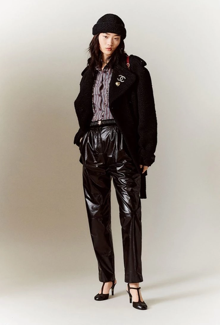 Sus siluetas mezclaban tweeds con prendas de cuero y denim, incluido los total looks. Los combinó con botas de goma estampadas con un logotipo de doble C, o zapatos negros de taco bajo, guillerminas y botas con taco chino.