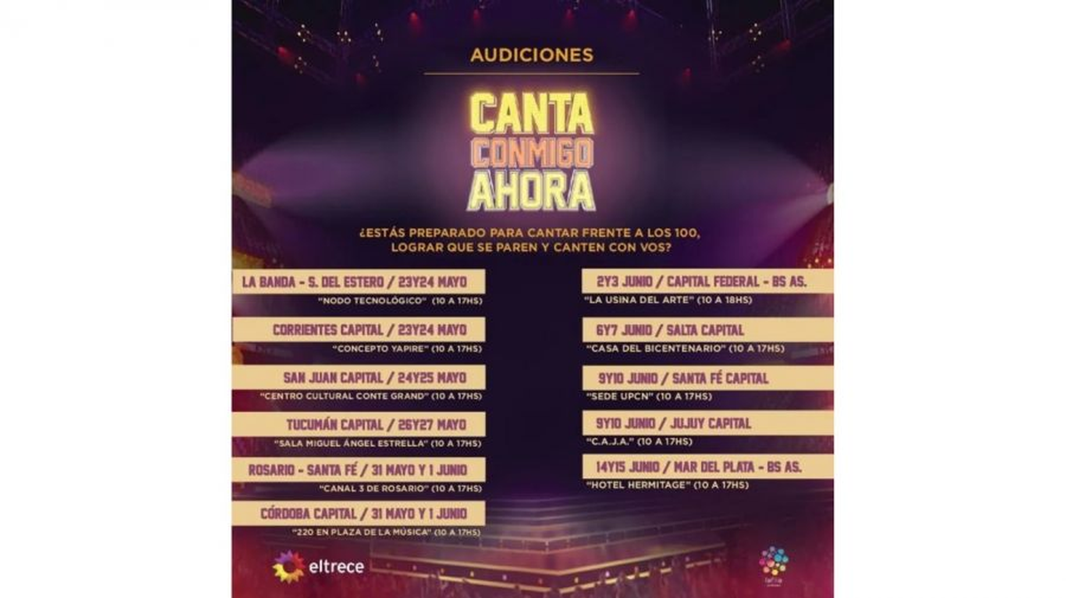 Redacción ShowOnLineEste jueves y viernes, entre las 10 y las 17 en la sala Miguel Ángel Estrella del Partido Justicialista (Virgen de la Merced 157), tendrá lugar la instancia de selección para Tucumán de los aspirantes a participar del reality “Canta conmigo ahora”, la nueva propuesta televisiva de Eltrece y la productora La Flia, de Marcelo Tinelli.