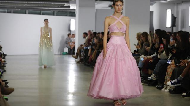Pero el rosa confirmó todas sus posibilidades adoptando matices más discretos. Giambattista Valli, fiel a su estilo romántico, nos invitó por ejemplo a lucir este vestido de corte romántico, de vuelo y tul, con aperturas, recordando que se trata de un color sumamente suave que ofrece numerosas posibilidades.