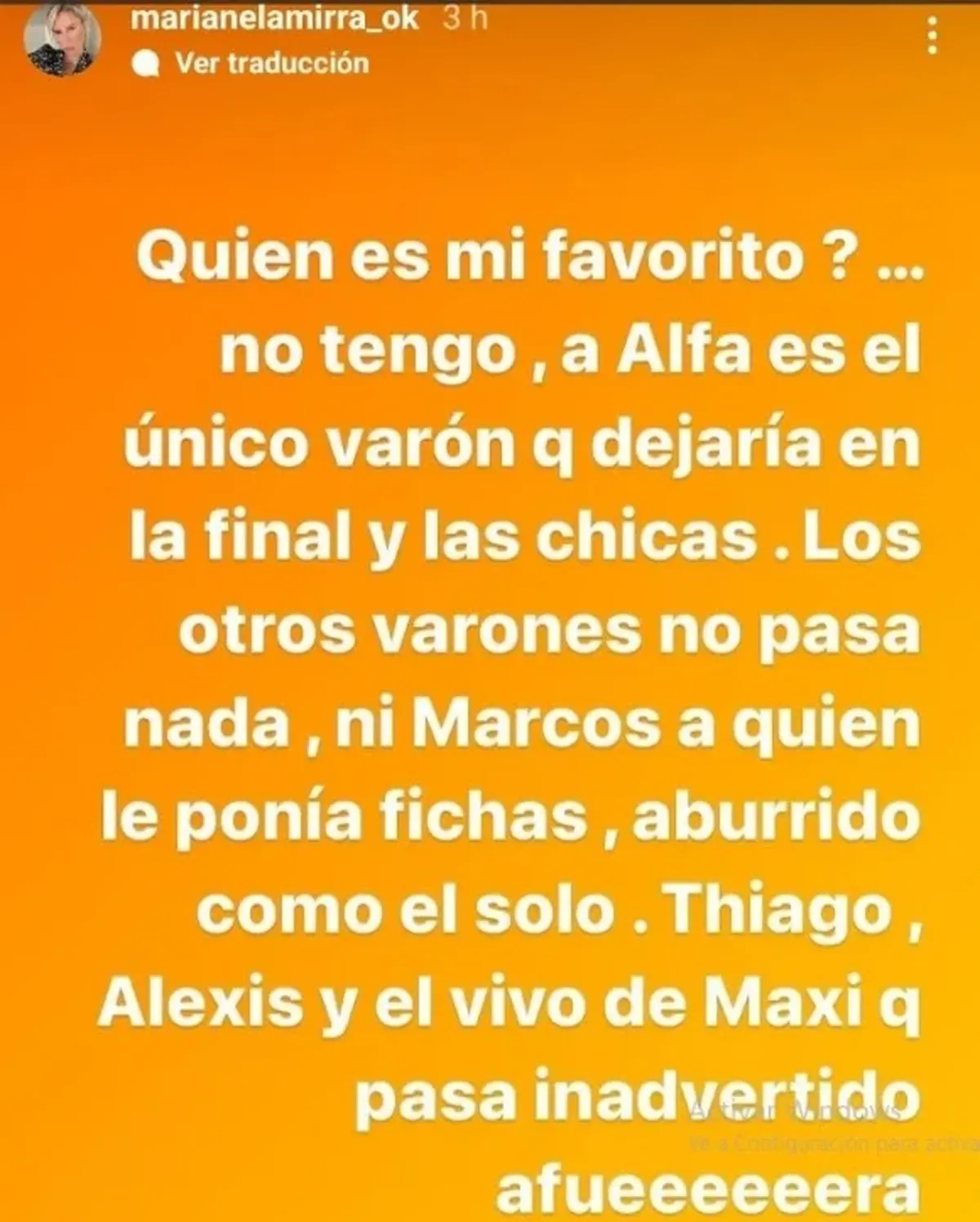 La tucumana reveló que creía que Marcos iba a sorprender con su juego, pero eso nunca sucedió. "Los otros varones no pasan nada, ni con Marcos a quien le ponía fichas, pero es aburrido como él solo. Thiago, Alexis y el vivo de Maxi que pasa inadvertido, afuera", añadió.