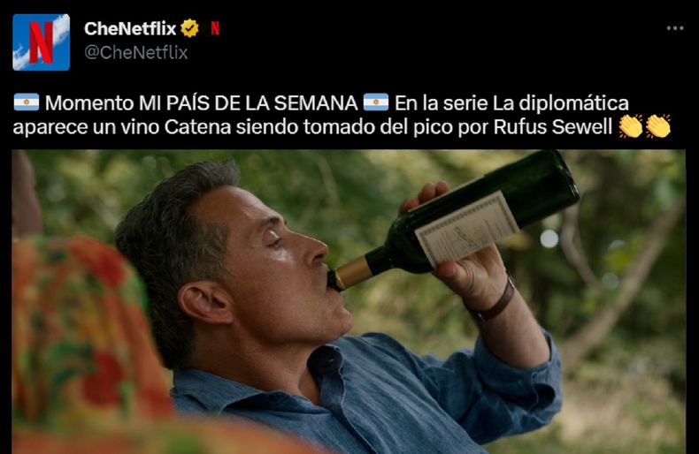 A través de la cuenta argentina de Netflix, compartieron la imagen del momento y escribieron: "Momento mi país de la semana: en la serie La diplomática aparece un vino Catena siendo tomado del pico por Rufus Sewell". Esta publicación sumó miles de interacciones con motivo de la euforia que existe durante cada guiño de una producción extranjera a la cultura nacional.