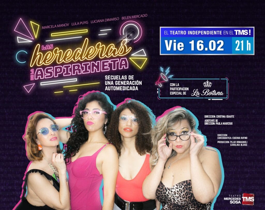 Te invitamos a conocer las historias y aventuras de estas cuatro amigas. Brillantes, ocurrentes, divertidas, coloridas y talentosas son estas mujeres, muy distintas pero unidas, que construyen un show con humor, actuación, baile y canto ¡para recordar los ́80s! Plasmando el mundo de lo femenino y sus desafíos. Juntas, nos harán reír a carcajadas y nos recordarán la importancia de la amistad y el poder del humor. "Las Herederas de la Aspirineta" está protagonizado por Belén Mercado, Marcela Manov, Luciana Dimarso y Lula Puyg. Con la dirección de Cristina Idiarte, Eugenia Rufino en la dirección coreográfica, la producción de Pilar Romagnoli y Carolina Bloise, y en la asistencia de escena Paula Marcoux. En ésta ocasión estarán acompañadas por la glamorosa compañía de baile LA BOTANA, que ofrecerá toda su destreza y sensualidad en el escenario.