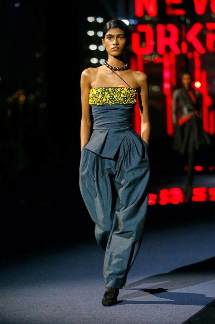 Tory Burch dejó en claro que los pantalones chinos pueden ser de lo más versátiles y pueden ajustarse a cualquier ocasión. Para el día a día, la firma propone combinar unos en azul marino con una camisa blanca, un chaquetón oversize en azul cielo y un fular al cuello en verde oliva. Una alianza de colores suaves que también es capaz de traducir en unos códigos más sofisticados, sumándole un top desestructurado, al que le añade una manga asimétrica en un azul turquesa.