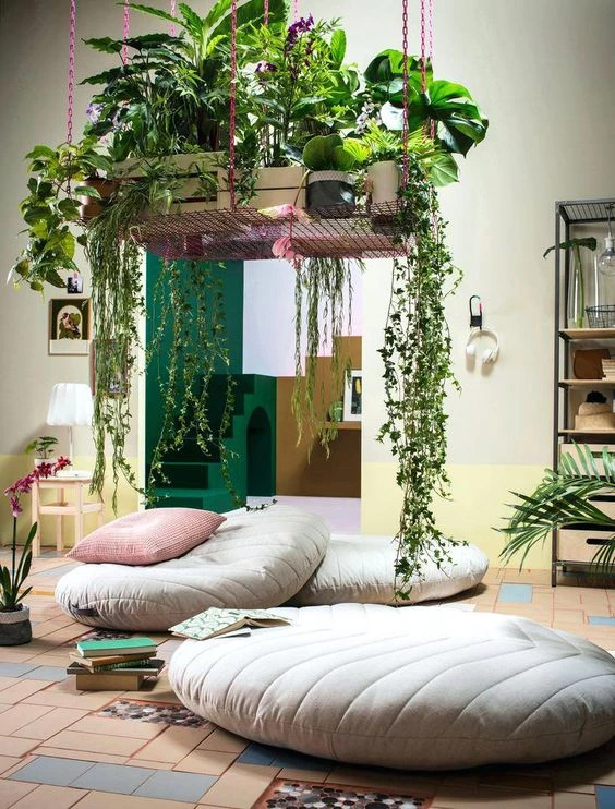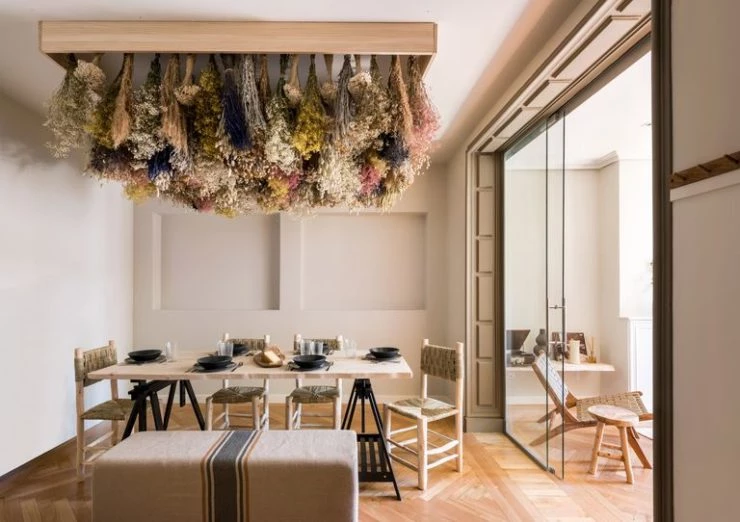 Las cocinas y los comedores son uno de los espacios favoritos para aplicar esta tendencia. A través de estructuras de hierro o madera colocadas directamente en el techo, se incorporan diferentes especies de plantas colgantes.